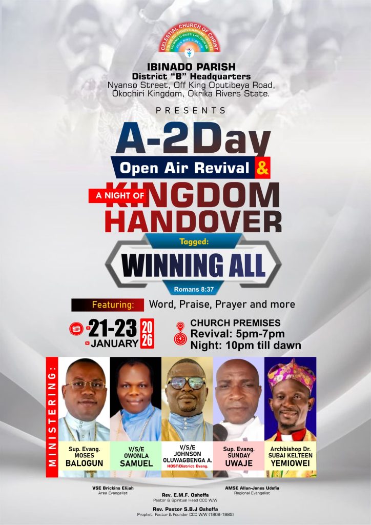 A 2-Day Open Air Revival programme themed “A Night of Kingdom Handover,” featuring Word, Praise, Prayer and lots more, organised by the Celestial Church of Christ, Ibinabo Parish comes up from Wednesday 21st January to Friday 23rd January 2026.
