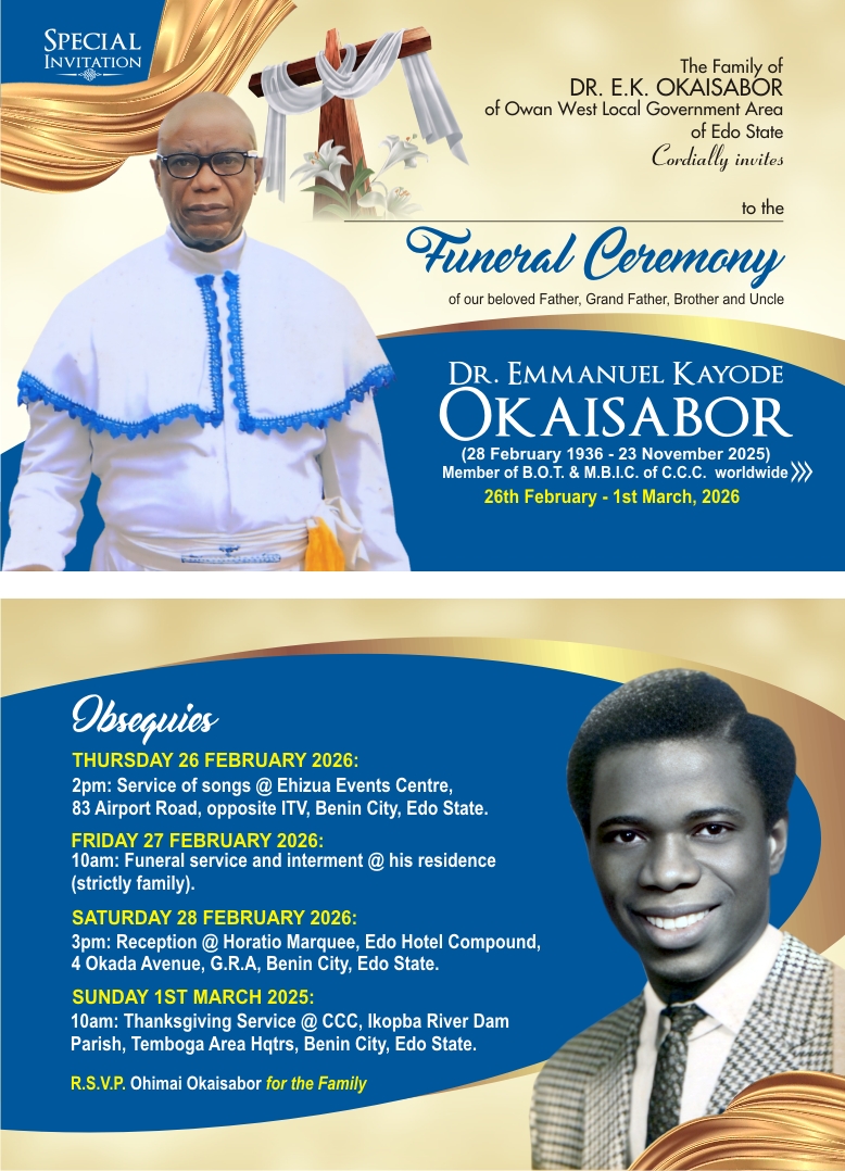 The Okaisabor family has announced the funeral events for the departed former C.C.C Board of Trustees member, Superior Evangelist Emmanuel Kayode Okaisabor, who transited to higher glory on 23rd November, 2025, at the age of 89.