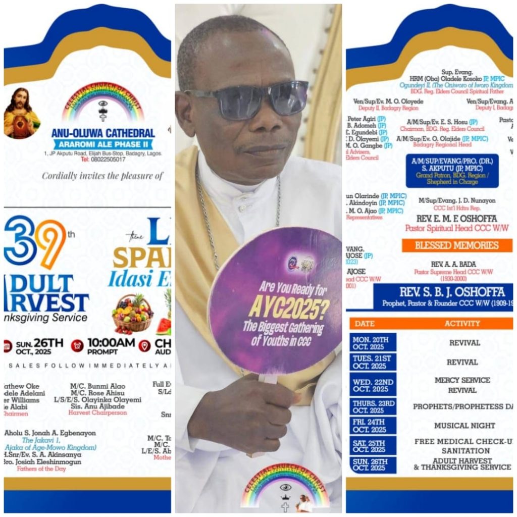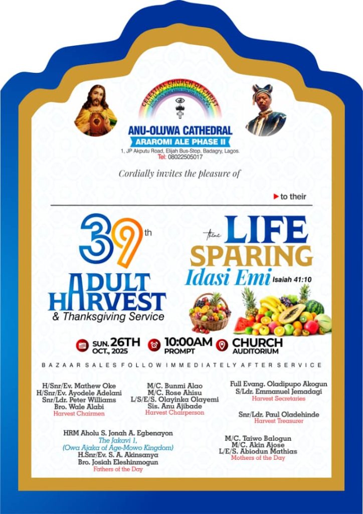 Araromi Ale Phase II, Badagry, Lagos, would be agog with pomp and pageantry as the Celestial Church of Christ, Anuoluwapo Cathedral holds her 39th Adult Harvest Thanksgiving Service on Sunday 26th September 2025.