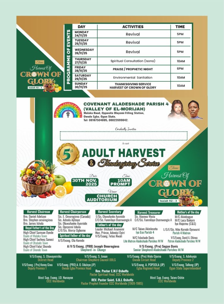 The Adult Harvest and Thanksgiving Service would hold on Sunday, 30th November 2025, at the church auditorium.