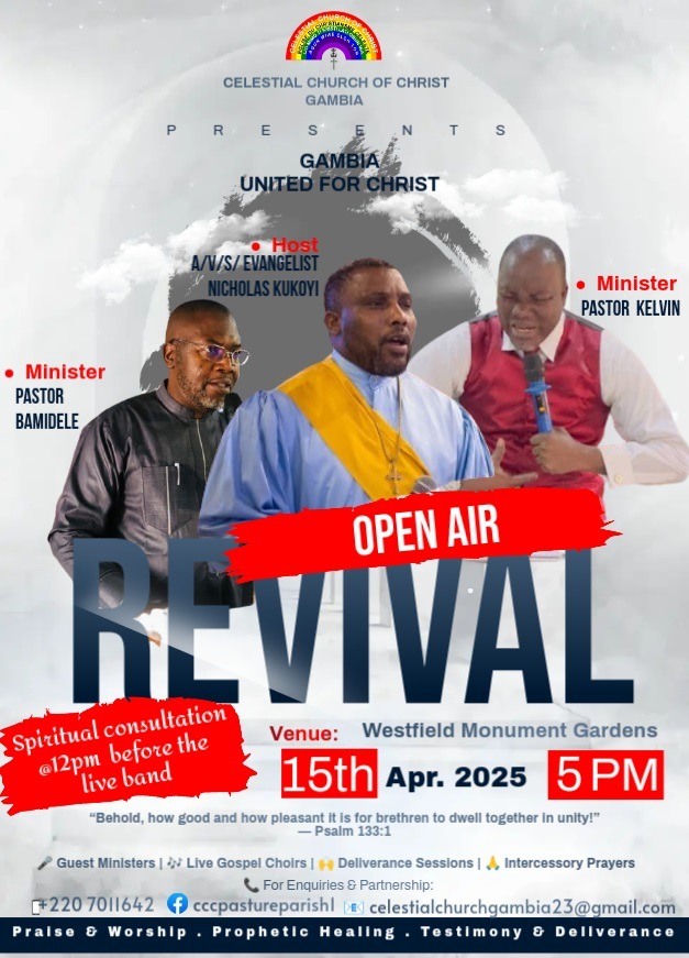 The Celestial Church of Christ in Gambia is set to hold an Open Air Revival on Tuesday, 15th April, 2025, at the Westfield Monument Gardens, Gambia.