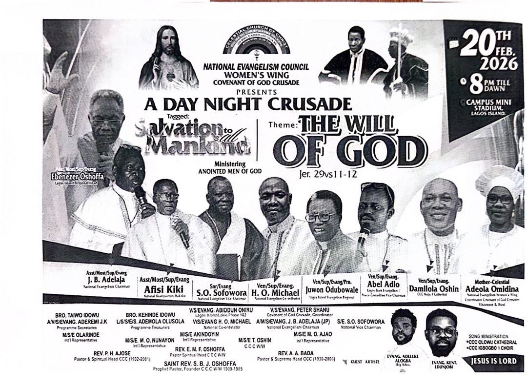 The Women’s Wing, National Evangelism Council, Celestial Church of Christ Worldwide, is set to hold a powerful crusade – “Salvation to all Mankind,” with the theme “The Will of God.”