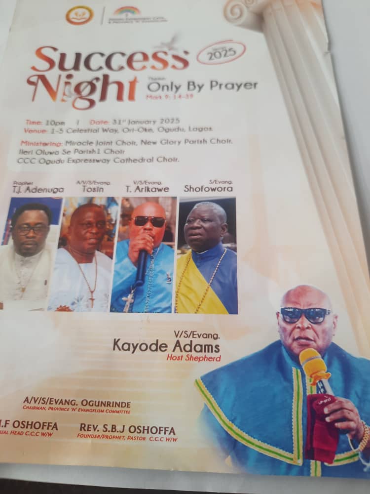 Celestial Church of Christ, Ogudu Expressway Cathedral, Ogudu, Lagos, is set to hold a spirit filled and power packed revival with the theme “Success Night, Only by Prayer,” on Friday, 31st January, 2025. Time: 10.00 pm.