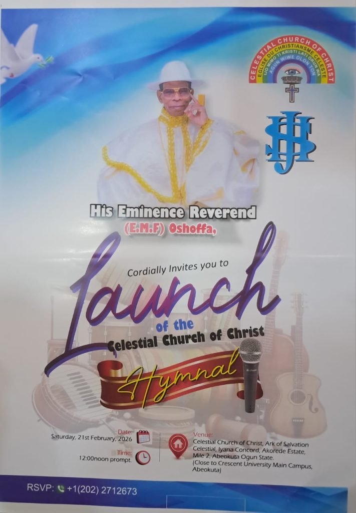 The Celestial Church of Christ (C.C.C) Worldwide is set to officially launch its new hymnal on Saturday, 21st February, at the Celestial Church of Christ, Ark of Salvation Cathedral, Abeokuta, Ogun State, a landmark edifice built by the Spiritual and Administrative Head of the Church, His Eminence, Reverend Pastor Emmanuel Mobiyina Friday Oshoffa.