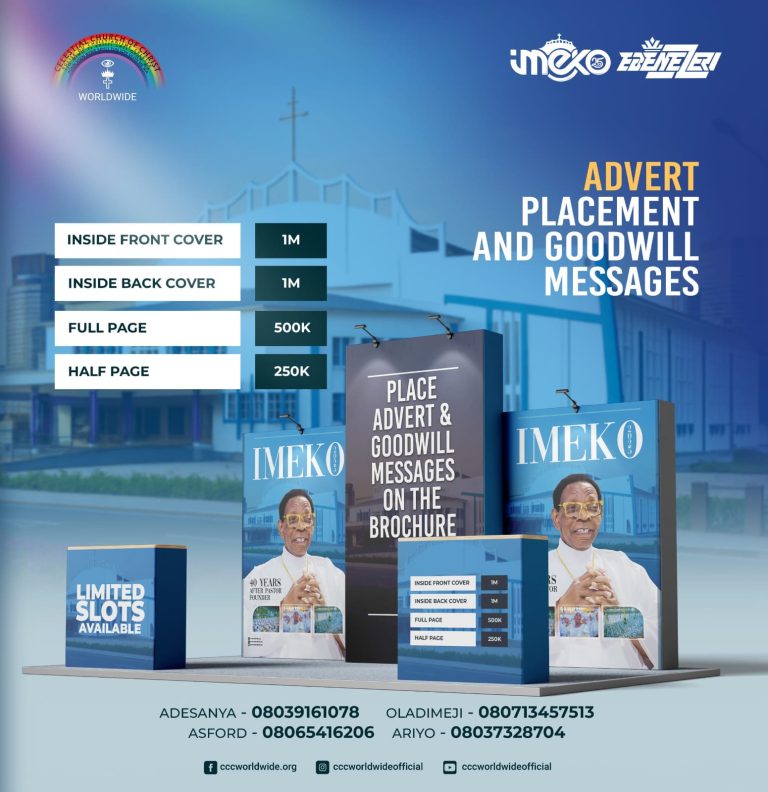 0 The Church PLACE YOUR ADVERTS IN THE DECEMBER 2025 IMEKO CONVOCATION BROCHURE…NOW!!! November 23, 2025 by Kayode Ajala