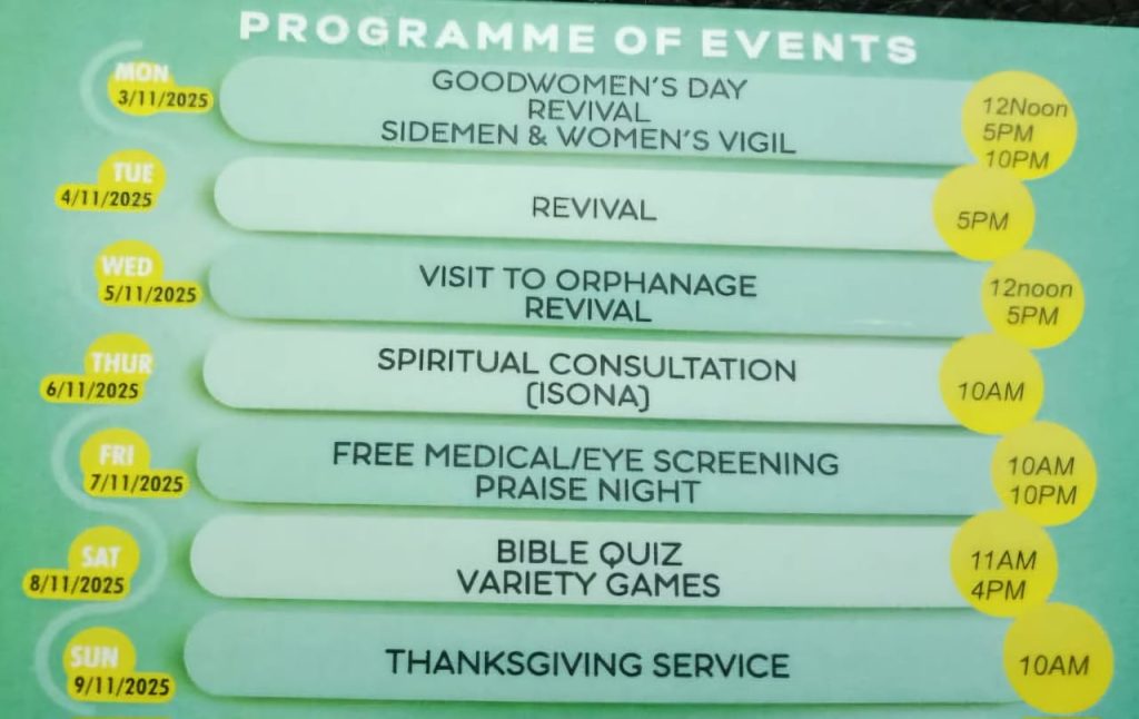Themed “Harvest of Great Exploits,” the Harvest Week would commence on Monday 3rd November 2025, and would feature activities like Good Women’s Day, Revivals, Sidemen and Women’s Vigil, Visit to the Orphanage, Spiritual Consultation, Free Medical/Eye Screening, Praise Night, Bible Quiz and Variety Games.