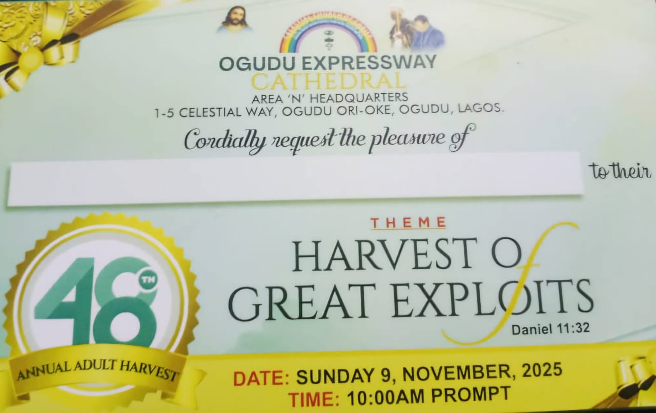 Sunday, 9th November, 2025, has been set aside as the date for the celebration of the 48th Annual Adult Harvest Thanksgiving Service of the Celestial Church of Christ, Ogudu Expressway Cathedral, Area “N” Headquarters, 1-5 Celestial Way, Ogudu Ori Oke, Ogudu, Lagos.