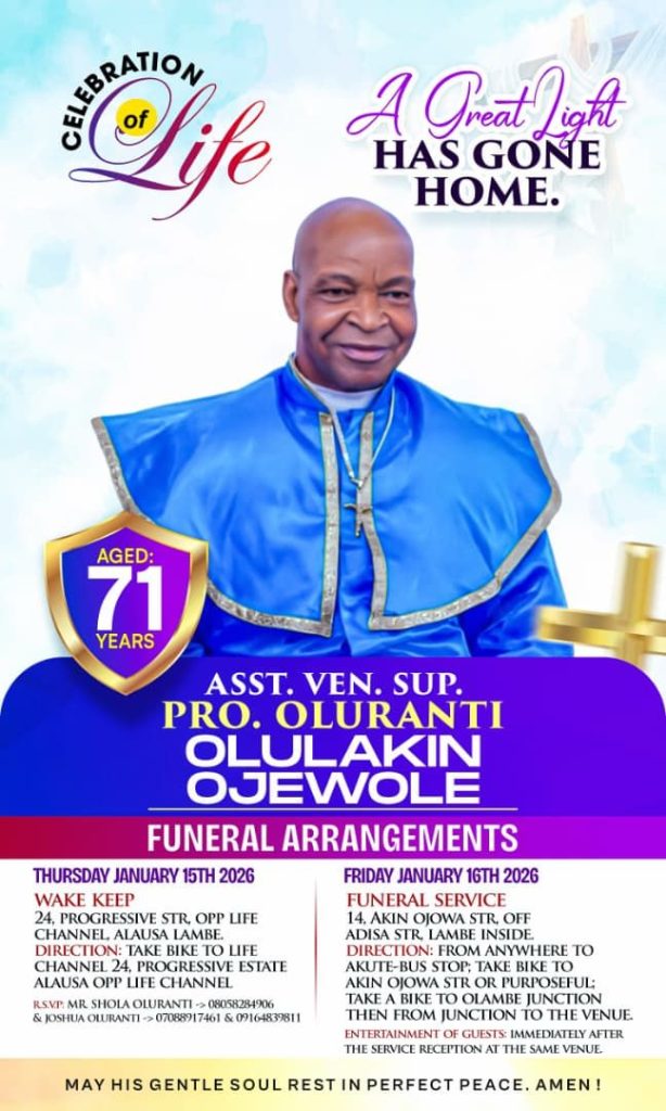 Celestial Church of Christ, Calvary 1, Aguda-Ogba, Lagos, announces the transition to higher glory of Assistant Venerable Superior Evangelist Oluranti Olulakin Ojewole, which occurred on Sunday 11th January, 2026.