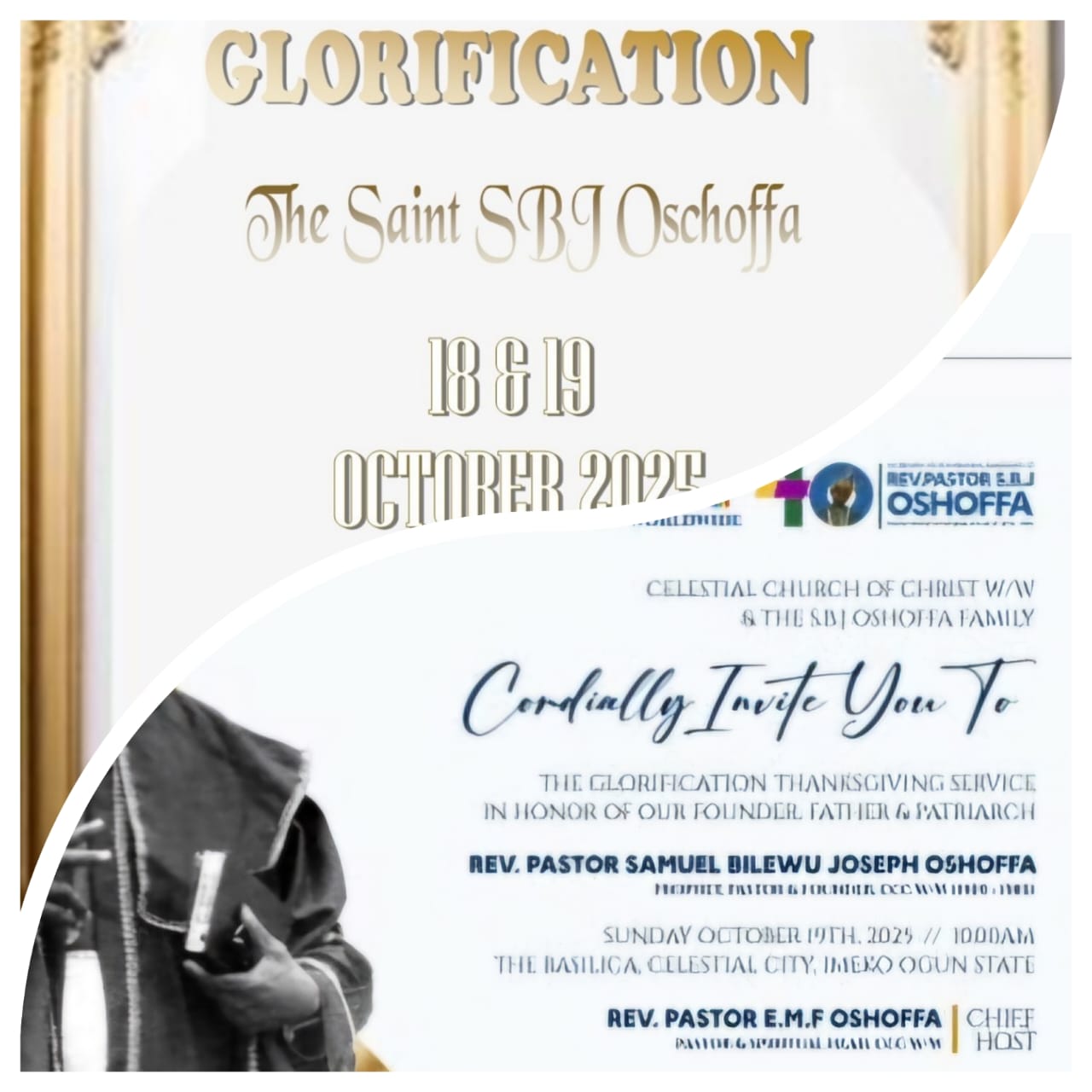 His Eminence, Reverend E.M.F Oshoffa, Pastor and Spiritual Head of the Celestial Church of Christ Worldwide, therefore seizes this opportunity to invite all members of the fold to the Memorial events and the GLORIFICATION SERVICE scheduled for Saturday,18th October, and Sunday, 19th October, 2025, at the Celestial City, Imeko, Ogun State.