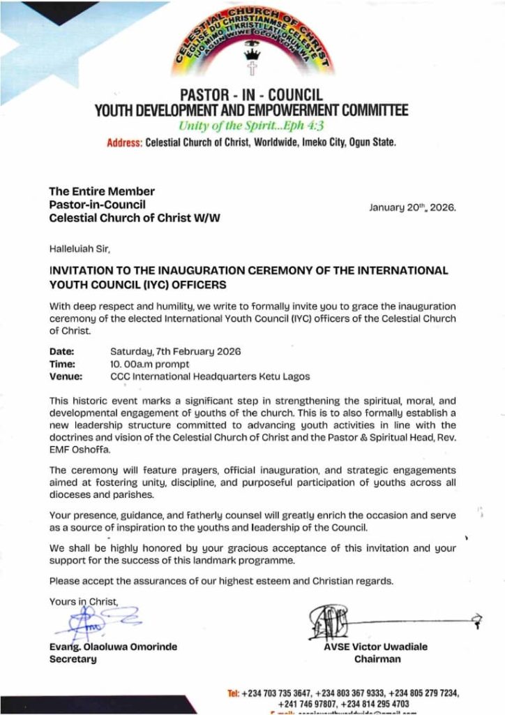 The Pastor in Council Youth Development and Empowerment Committee respectfully invites you to the inauguration ceremony of the International Youth Council officers.