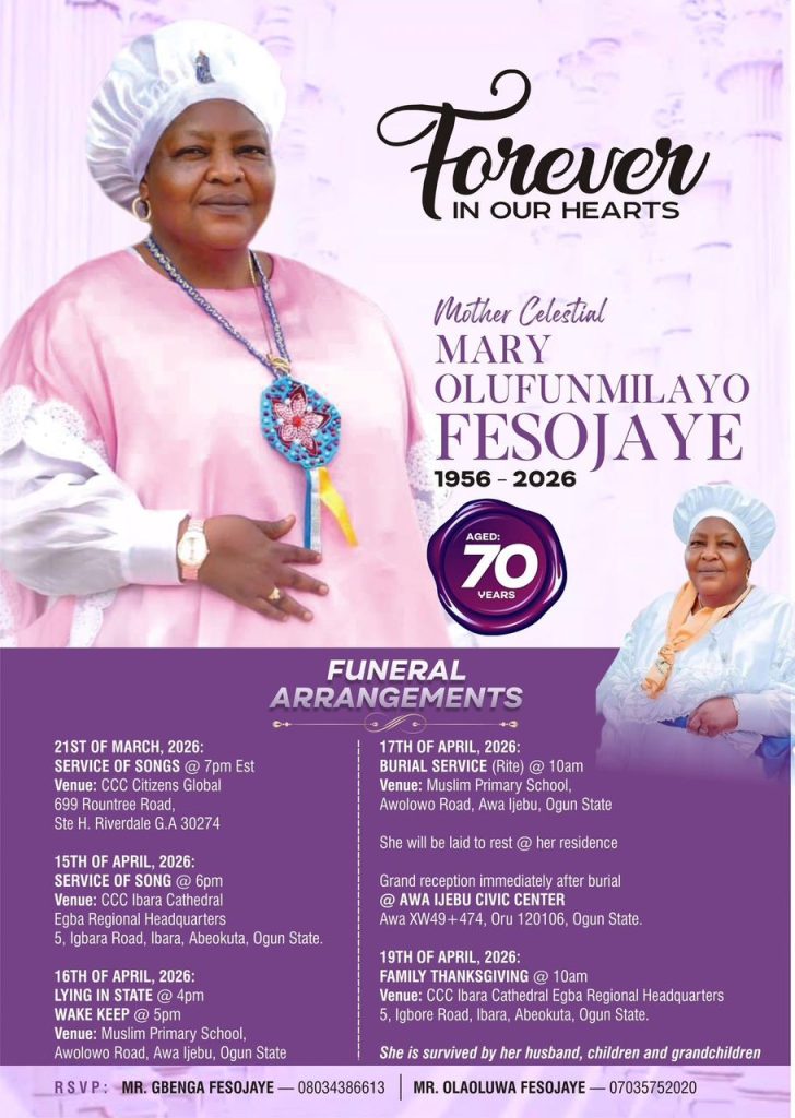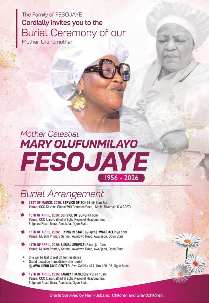 Wife of AMSE Fesojaiye (Shepherd, C.C.C Ibara Cathedral, Abeokuta, Ogun State), Mother Celestial Mary Olufunmilayo Fesojaye, would be interred on Friday 17th April, 2026, at her residence in Awa Ijebu, Ogun State.