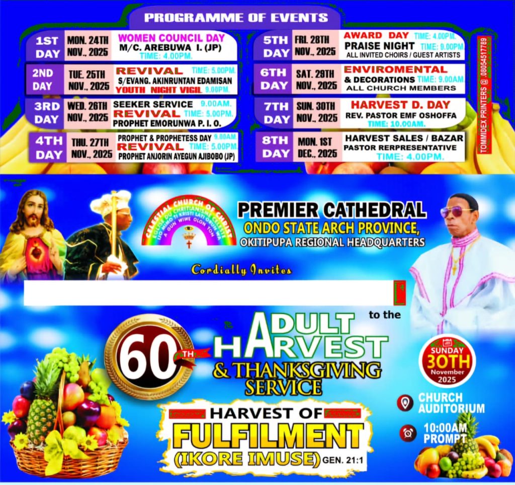 The 60th Adult Harvest Thanksgiving Service of Ondo State Premier Cathedral, Okitipupa Regional Headquarters, Old Aye Road, Okitipupa, Ondo State, would hold on Sunday 30th November 2025.