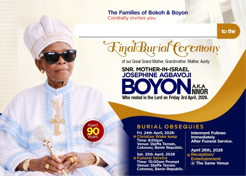 The Shepherd in Charge of Celestial Church of Christ, Elyon Parish, Badagry, is set to give his beloved mother, Senior Mother in Israel Josephine Agbavoji Boyon, aka Nnor, a befitting burial come 24gh, 25th and 26th April, 2026.