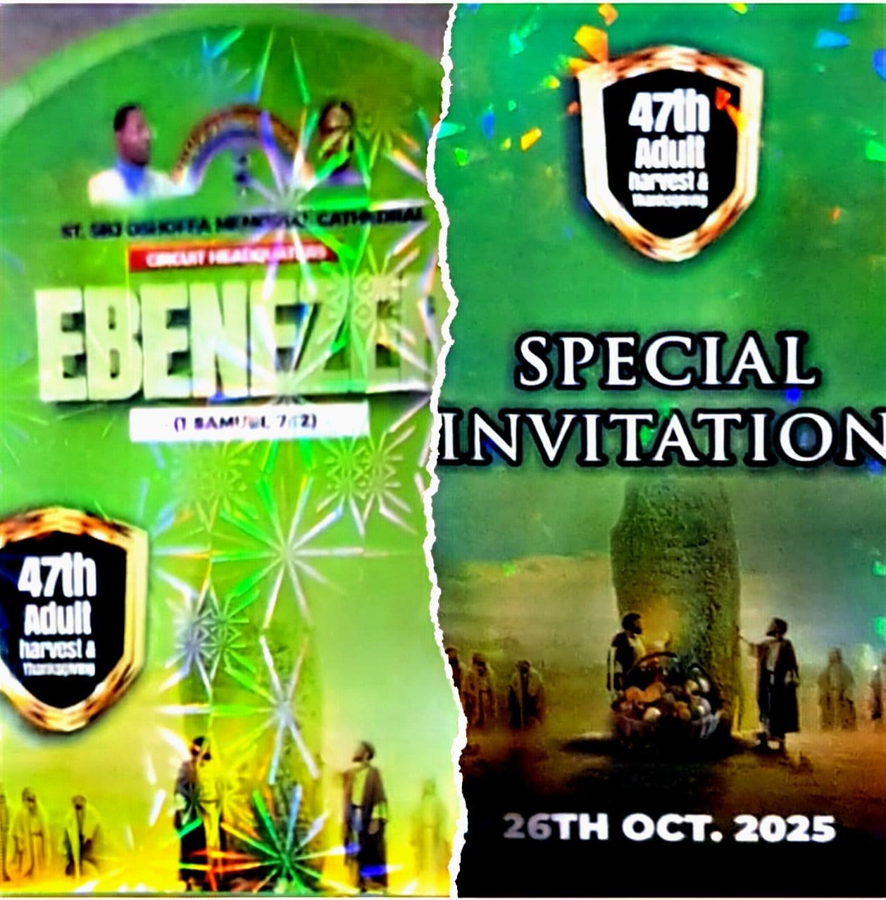 The Adult Harvest Thanksgiving Service is scheduled for Sunday, 26th October, 2025, at 10.00 am prompt. Venue is the church auditorium located at 66 Surulere Street, Dopemu, Agege, Lagos.